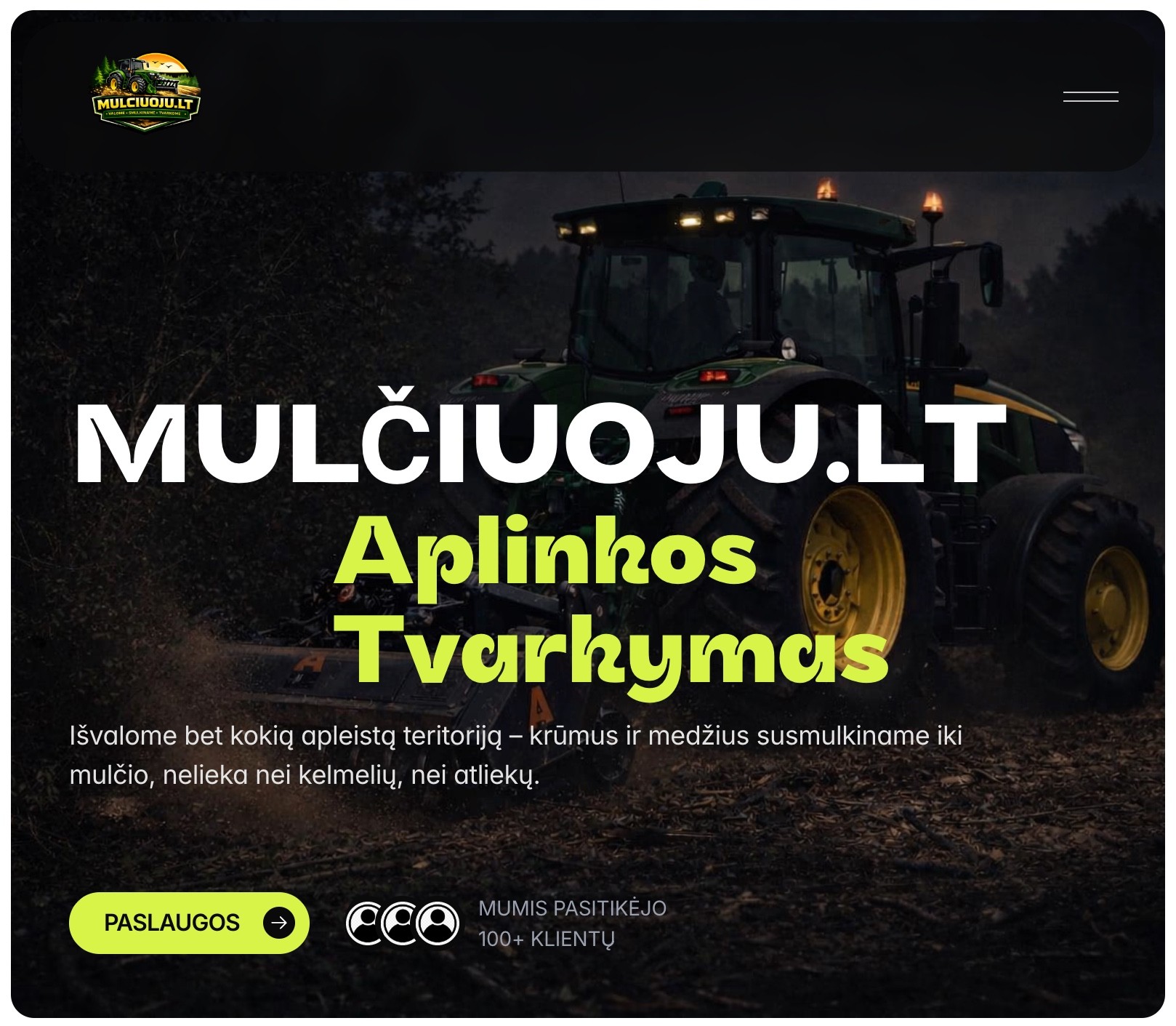 Didelį dėmesį skyrėme stipriam vizualiniam įspūdžiui – pagrindinis puslapis iš karto komunikuoja galią ir profesionalumą per techniką bei aplinkos tvarkymo procesą. Aiškūs antraštiniai tekstai ir struktūra leidžia greitai suprasti teikiamas paslaugas bei jų vertę.